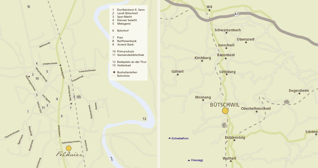 Dank guter Zugverbindungen erreichen Sie grössere Ortschaften wie Wil, Wattwil oder Winterthur bequem mit dem Zug im Halbstundentakt. Sind Sie in Ihrer Freizeit gerne aktiv, laden die umligenden Hügel zum Wandern oder Biken ein. Nur wenige hundert Meter von der Feldwies entfernt, lockt im Sommer der öffentliche Badeplatz an der Thur mit seinem kühlen Nass. Im Winter sind die Toggenburger Skigebiete rasch erreichbar. Bütschwil ist lebendig und gleichzeitig überschaubar. Schätzen Sie diesen Mix, ist Feldwies der ideale Lebensmittelpunkt für Sie.